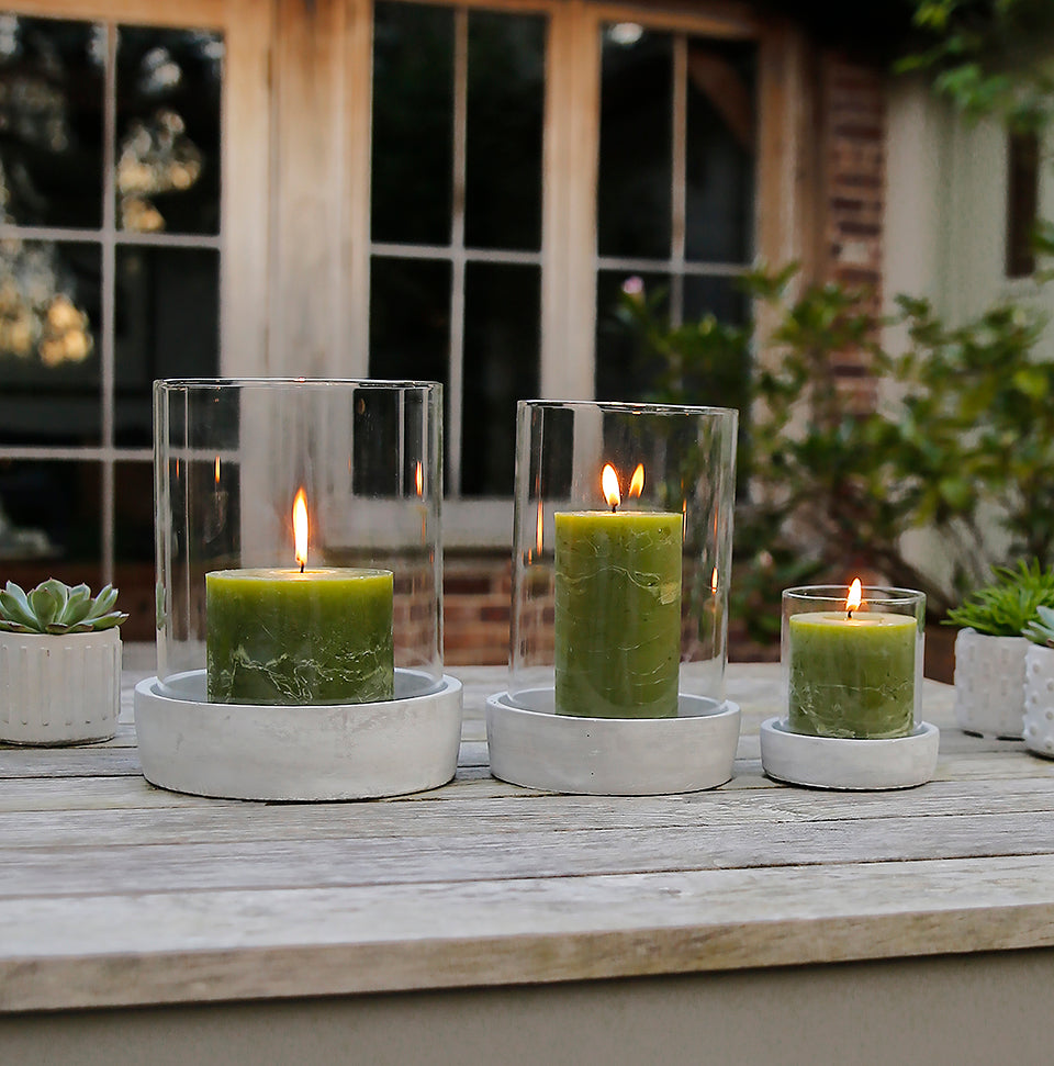 Der transparente Glasbehälter steht auf einem runden, glatten Betonsockel mit schützenden Gummifüßen. Ideal für Kerzenlicht im Haus oder zum Speisen auf dem Gartentisch in der Jahreszeit. Erhältlich in drei Laternengrößen. Wird als einzelner Kerzenhalter verkauft.