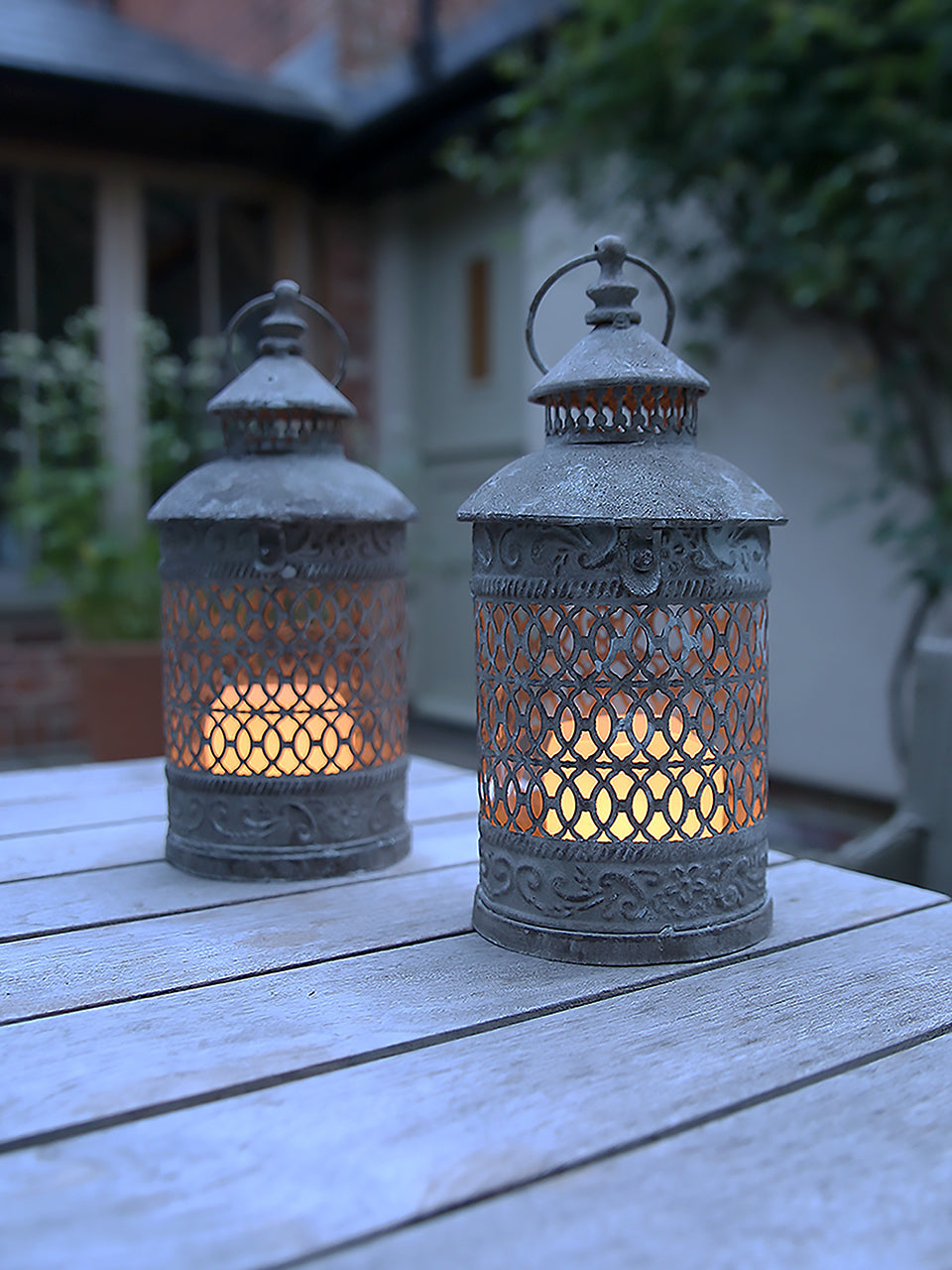 Attraktive graue Metalllaterne mit filigranem Gittermuster, die für gemütliches Kerzenlicht am Abend in Haus und Garten sorgt. Ideal für Stumpenkerzen für langanhaltende Beleuchtung. Jede Laterne besteht aus einem Glasrahmen mit Metalleinfassung, Belüftungsöffnung und Griff.