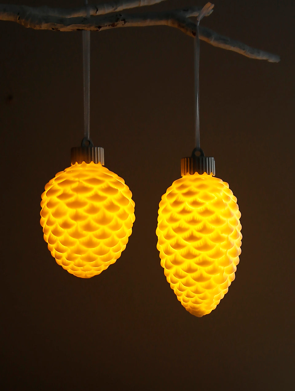 Die reinweißen, leuchtenden Keramikkugeln in Tannenzapfenform bestechen durch ihr detailliertes Oberflächenmuster. Im Dunkeln bilden sie einen wunderschönen Blickfang am Weihnachtsbaum.
