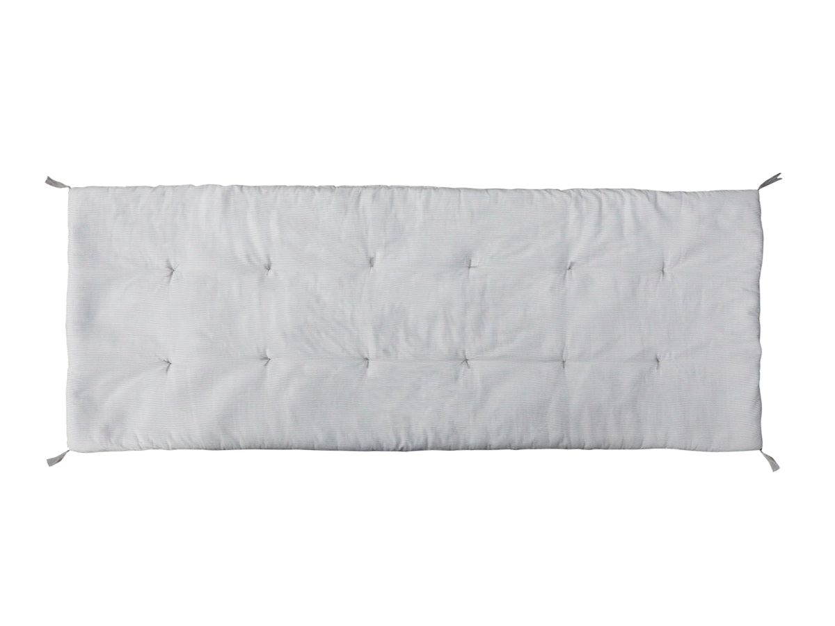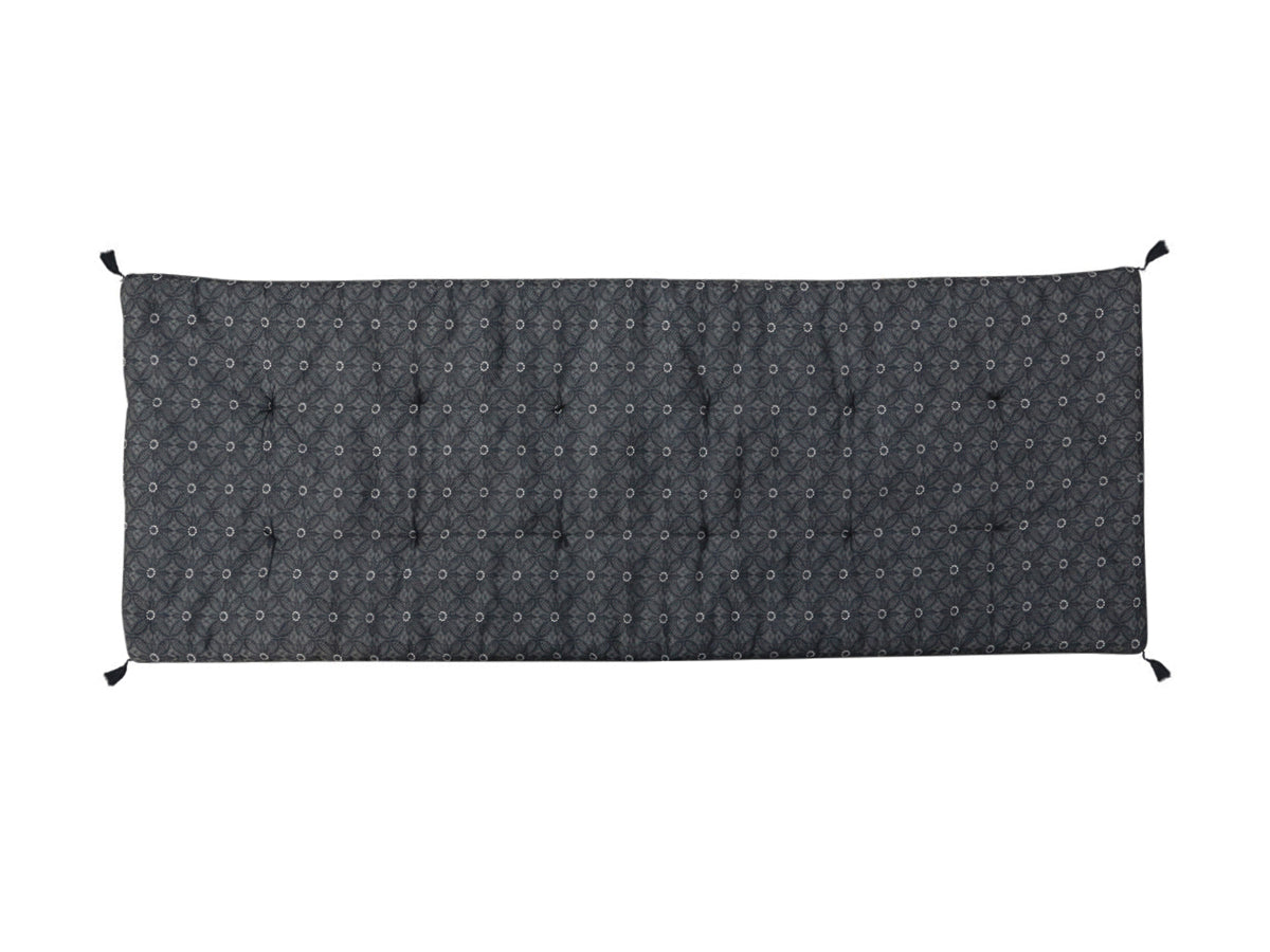 Gepolsterte Decke für mehr Komfort auf harten Oberflächen, ob drinnen oder draußen. Ideal für Bänke oder Picknicks in den wärmeren Monaten. Erhältlich in tiefem Anthrazit mit Blattmotiv, weißem Blumenmuster oder in einem helleren, gestreiften Weiß-Grau, jeweils mit Quasten an den Ecken. Lieferung im praktischen Beutel mit Kordelzug zur einfachen Aufbewahrung. Maschinenwäsche bei 30 Grad.