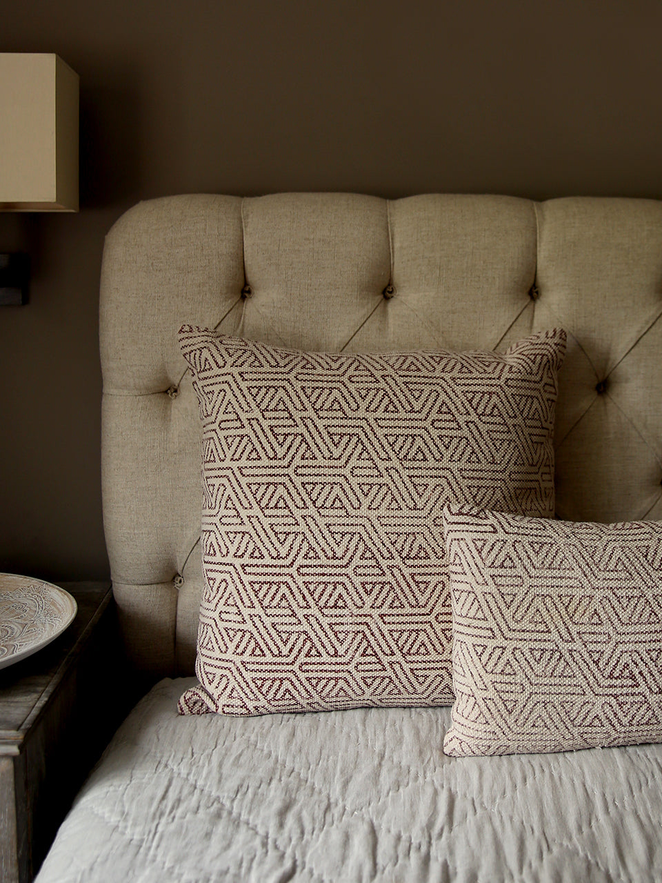 Ein wunderbar weiches Baumwollkissen in warmen Terrakottatönen. Das dezente Labyrinthmuster verleiht ihm einen zurückhaltenden, modernen und entspannten Look. Inklusive Kissenfüllung. Schlichte, cremeweiße Baumwollunterseite. Erhältlich in quadratischer und rechteckiger Form.