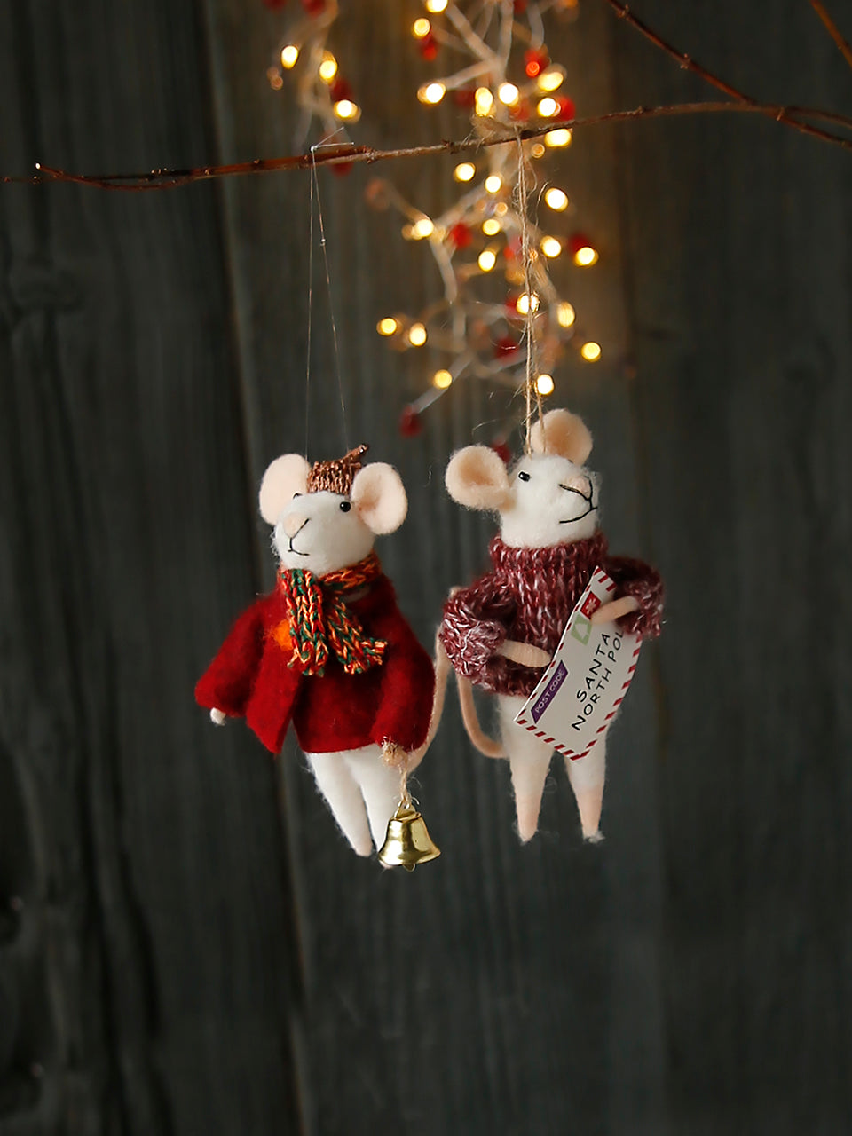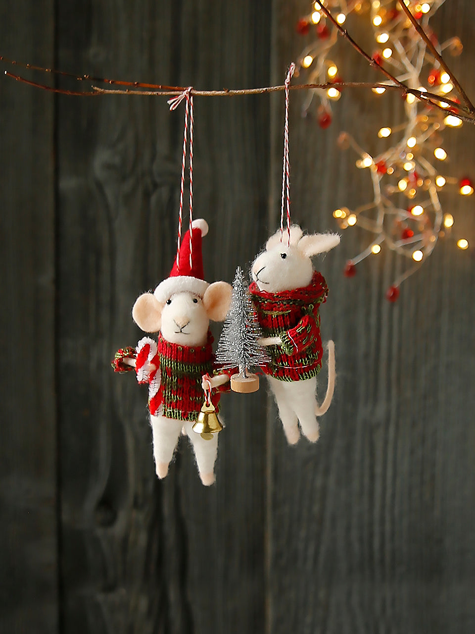 Handgefertigte Weihnachtsmäuse, warm eingepackt, mit Geschenken wie Zuckerstangen, Tannenbäumen oder einer Nachricht für den Weihnachtsmann. Bereit zum Schmücken des Weihnachtsbaums und ein festlicher Blickfang in jeder Weihnachtszeit.