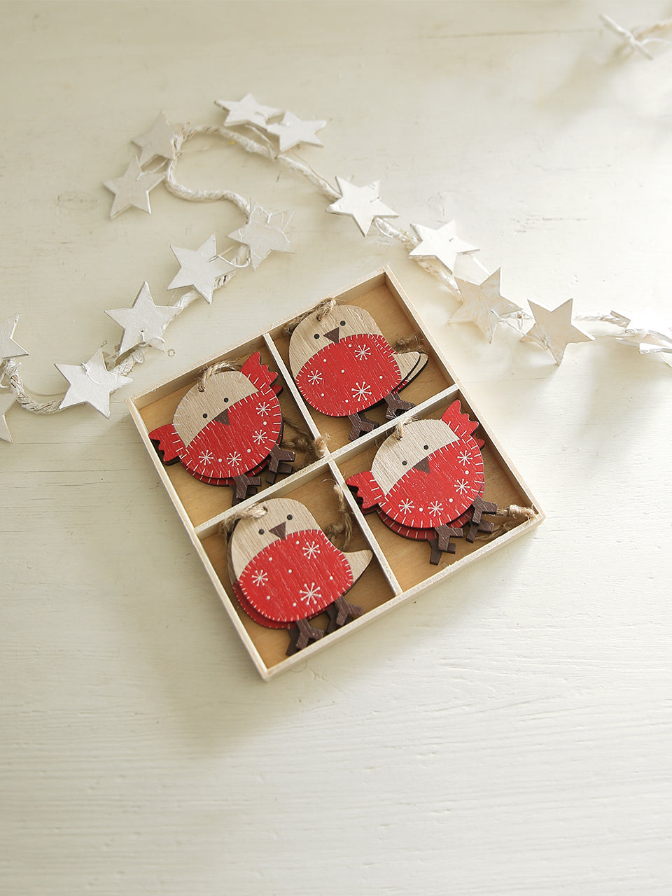 Jedes Set enthält vier Rotkehlchen in zwei verschiedenen Designs – das rundlichere hat sich eindeutig zu viel am Futterhäuschen bedient! Die Dekorationen sind bereits mit einer Schnur versehen und eignen sich ideal zum Schmücken des Weihnachtsbaums oder zum Verzieren von Geschenken.